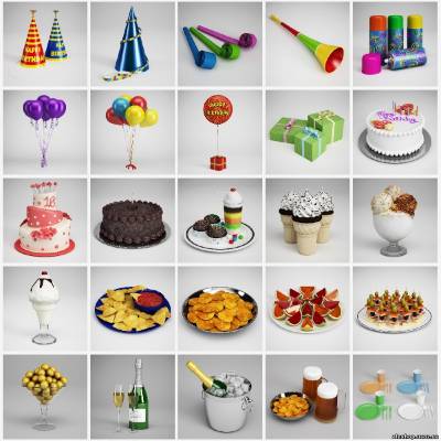Описание: Данный сборник включает в себя 25 высоко детализированных моделей гаджетов для вечеринок (воздушные шары, торты, головные уборы, мороженое, чипсы, шампанское и многое другое).