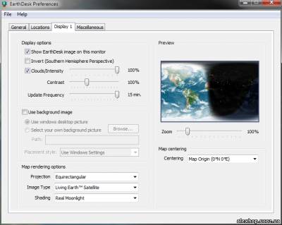 Описание: программа заменяет обои рабочего стола в операционных системах Mac OS и Windows на динамически изменяющийся вид нашей планеты, как будто, вы смотрите на нее из космоса. При подсоединении к Интернету программа получает данные о текущем состоянии освещенности Земли, расположении облаков, циклонов, тайфунов и т.д. При желании вы сможете выставить уровень прозрачности слоя облаков, а также настроить отображении других элементов карты.