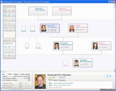 Дополнительная информация Основные преимущества программы: Простой и удобный интерфейс, который легко освоит даже начинающий пользователь. Возможность внесения огромного количества подробных данных о каждой персоне: биография, фотоальбом, события жизни. Автоматическое построение схемы генеалогического дерева на основе введенных данных. Очень богатые возможности по настройке внешнего вида семейного дерева: можно перемещать фигуры, изменять способ их отображения, задавать фоновый рисунок и др. Создание общих семейных фотоальбомов с уникальными возможностями: задание подписей и комментариев к фото, указание на фотографиях персон.