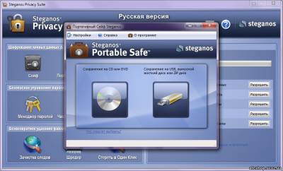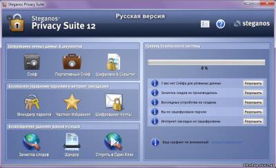 Steganos Privacy Suite - комплекс утилит для всесторонней защиты ваших данных на PC и в Интернете с использованием методов криптографии и стеганографии (способ шифрования данных, который скрывает сам факт шифрования). Программа позволяет шифровать данные, сохраняя их на виртуальном зашифрованном диске (при этом шифрование информации происходит со скоростью ~1 Гб/сек); прятать информацию в звуковых и графических файлах с сохранением их полной работоспособности (картинку можно посмотреть, музыку можно послушать); вести шифрованную переписку по электронной почте; блокировать компьютер; удалять файлы, не оставляя ни малейшего шанса на восстановление и т.д. Программа оборудована защитным механизмом, который предотвращает потерю информации при, например, исчезновении электропитания и других неприятностях.